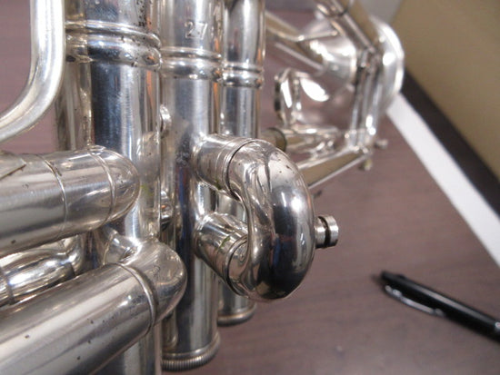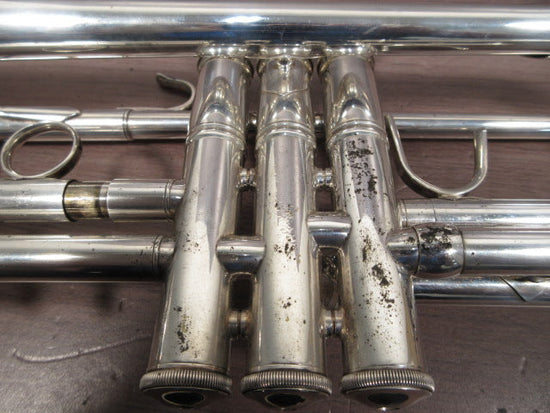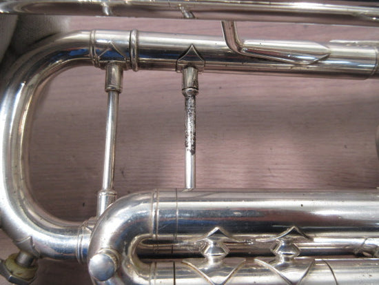 There are dents and scratches on the bell, and areas of dark discoloration ("black rust") visible on the surface. These are cosmetic signs of use, but there are no problems with the pistons or slides, and the instrument responds as expected for normal playing.