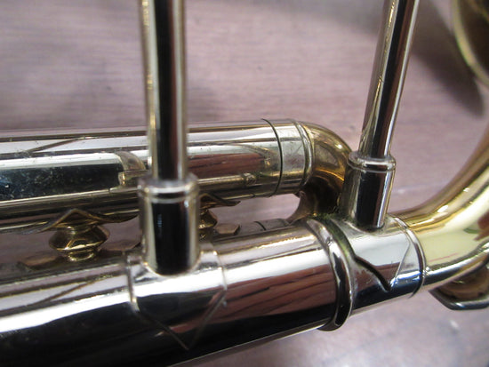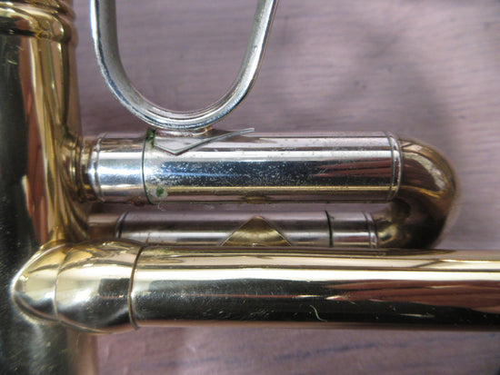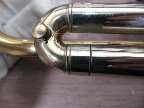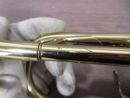 There are scratches on the body and a large dent in the bell, which are clearly visible cosmetic signs of age and use. However, the pistons and slides work fine, and the instrument responds as expected in normal playing situations.