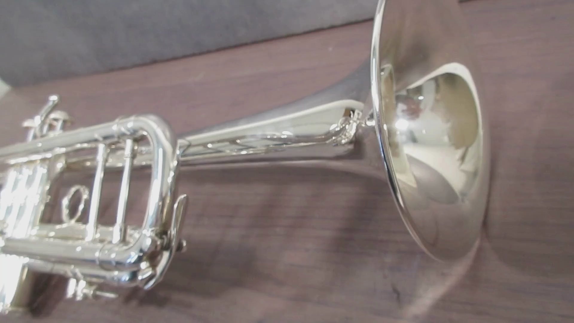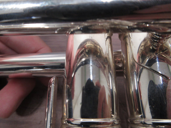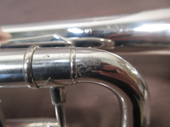 There is a dent in the bell and visible areas of dark discoloration (“black rust”) on the body, both of which are cosmetic signs of age and use. However, there are no problems with the pistons or slides, and the instrument responds reliably with smooth action in normal playing situations.