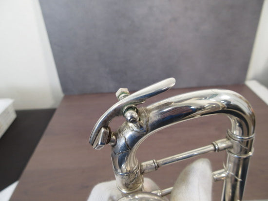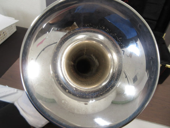 The bell has minor rust and dents from use, visible as cosmetic signs of age, but the pistons and slides are in good working order. The instrument responds reliably, with smooth action and a comfortable blow for everyday playing situations.